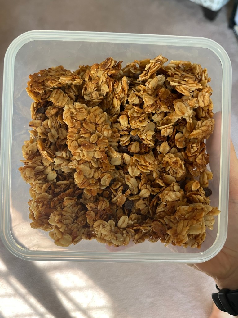 I promised y’all I would share my homemade granola recipe from my Go-To Snacks post, and today is the day! I hesitate to even call this a recipe because it is so simple, but I think it tastes way better than store bought and it’s so much cheaper. I like to keep my granola simple and just add in some mini chocolate chips, but the options are endless. You can use it on yogurt, in cereal, or just eat it plain!