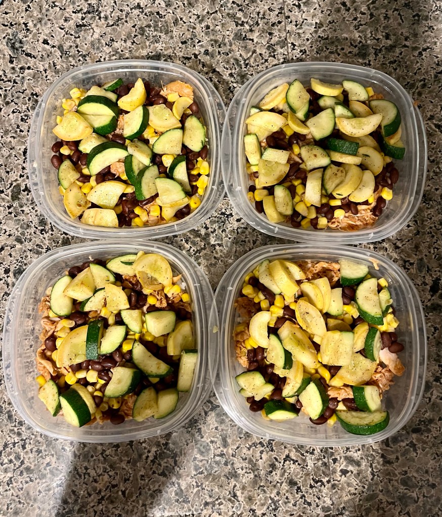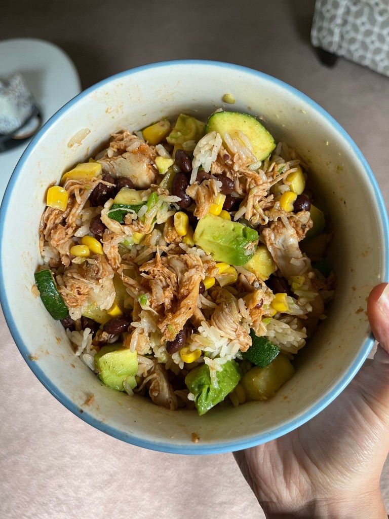 - Now, you can assemble your bowls! I layered the rice on the bottom, then chicken, and finished with the veggies, corn, and black beans. I left off the avocado until it was time to eat.
