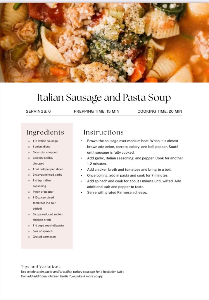Winter temperatures have finally arrived in NC and even though I don’t do great with the cold, I love everything that comes with it. Bring on the cozy sweaters, hot lattes, and, most importantly the soup! I have been making a lot of soup recently, but this Italian Sausage and Pasta Soup has been my absolute favorite. I’ve made it 3 times in the past month. It is simple, yet flavorful, and is packed with lots of veggies! The soup is originally made with Italian sausage, which is what I used the first time and it was delicious! The second time I made it I decided to try Italian-seasoned turkey sausage for a healthier option. Turkey sausage has much less sodium and saturated fat than Italian sausage while still maintaining the same amount of protein content. The soup tasted almost the same with the turkey sausage and I will be using it from now on! This recipe, like most of the recipes I share, works great as meal prep. The noodles do soak up the broth and get softer throughout the week. I don’t mind this and just keep some chicken broth on hand to thin each serving out as needed. If you prefer the pasta to stay more firm, you can always boil the pasta separately and add it to each serving the day of. I did this the first time I made it and it worked perfectly! Just make sure to reduce the amount of chicken broth you use in the soup by about a cup. If you give this soup a try let me know how you like it! I hope you enjoy it as much as I do!