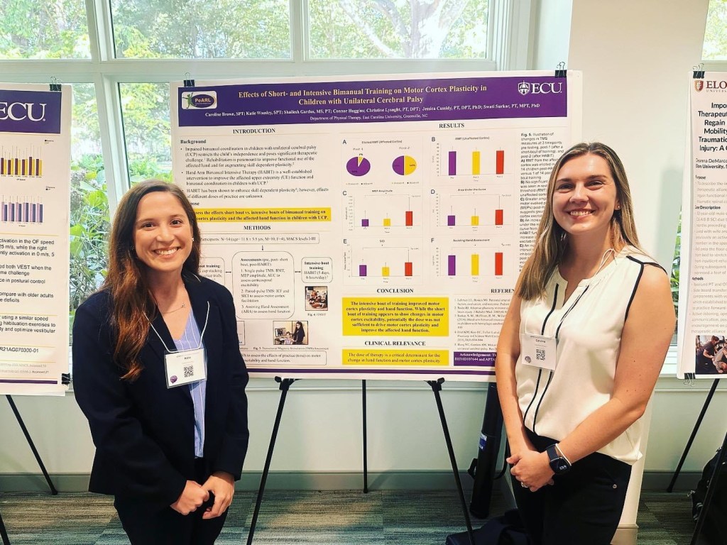 We utilized data collected from transcranial magnetic stimulation (TMS) and a hand function test to answer our research question. During TMS, a magnetic coil is used to stimulate the specific part of the brain responsible for hand movement to measure corticospinal excitability. Ideally, after training, it would take less stimulation for movement showing increased excitability. We found that the short bout of training was not enough to drive motor cortex plasticity and improve hand function. This demonstrates the importance of the dose of therapy and the need for intensive camps like HABIT. We presented our research at our university’s research day and two different conferences—NC APTA and APTA Combined Sections Meeting.